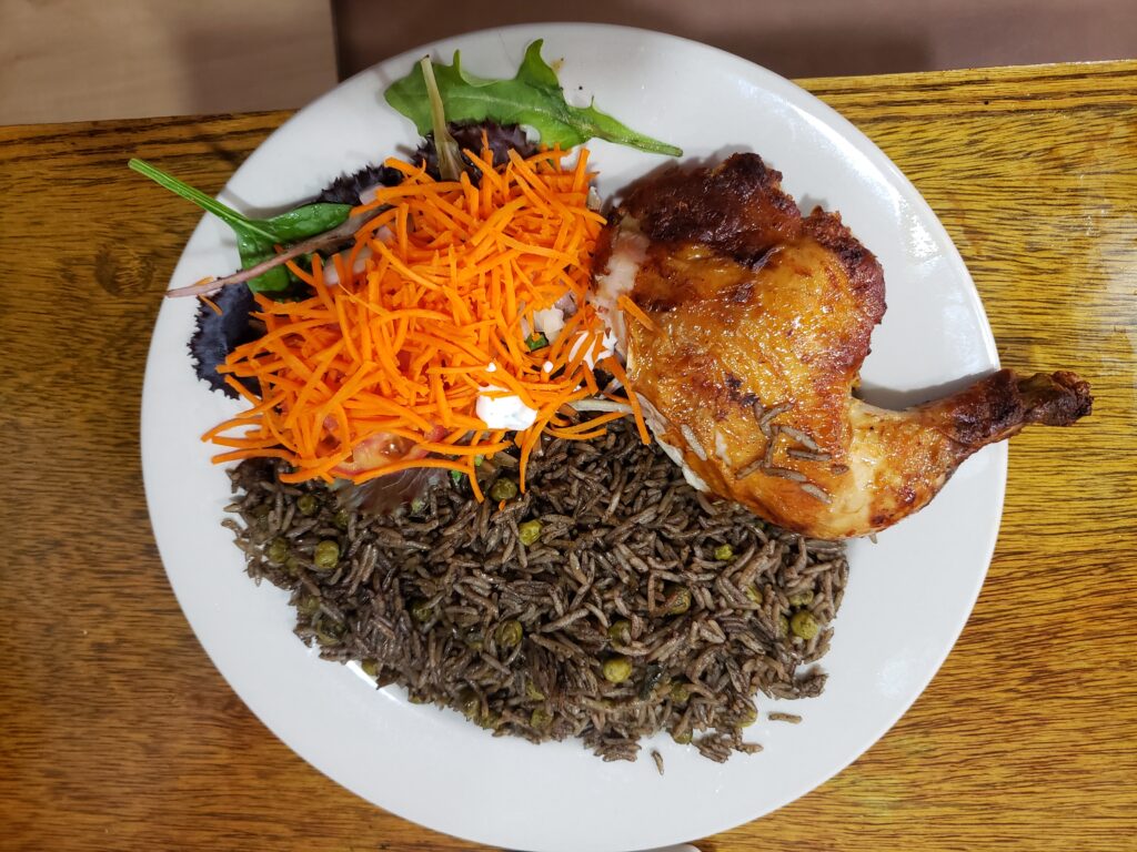 1/2 Chicken ………………………………………………………. $13.50 With White Rice, Beans and Salad